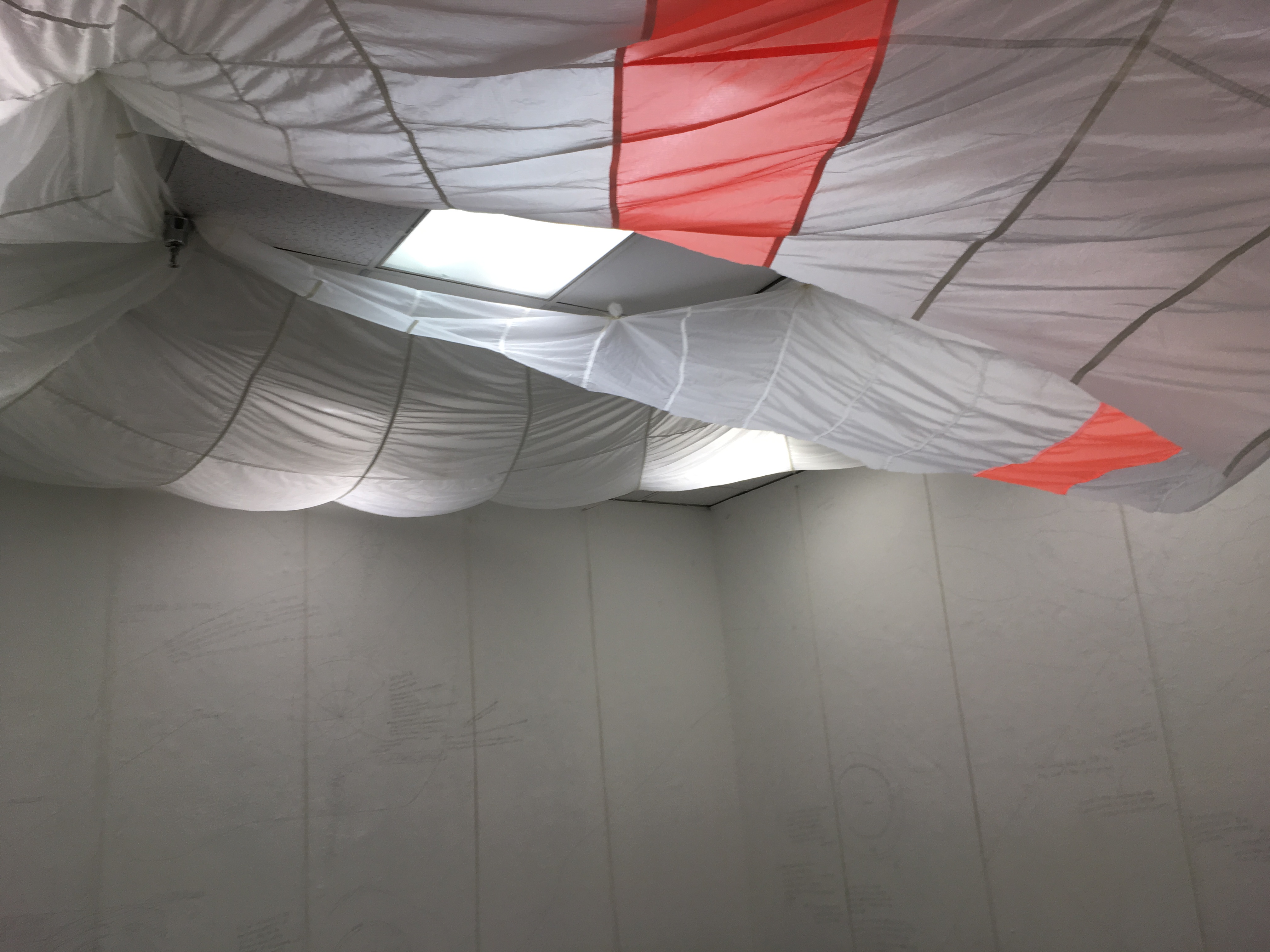 The disemboweled parachute, stretched and left loose (as to show signs of struggle) across the ceiling, casts a surrogate stratosphere over A402, referencing the state of Earth’s atmosphere in 2006 (in which the ozone hole had climactically assumed an area of 27 million km^2). The hole in the parachute—a sort of orifice—siphons deadly rays of fluorescent light (an aspect inherent to the A402 ceiling, performing UV) toward sculptures/objects littered on the gallery floor. Does this orifice, therefore, weaponize fluorescence, affecting a mass destruction, or channel it, like an oracle? Did/Does ozone depletion in the stratosphere, manifest as a hole, an absence, embody a premonition? Does it call to us? What does it say? The parachute imbibes a second connotation: a barrier that keeps a pilot or skydiver safe from death, but in its compromised structure, its deflation, stripped of its proper function. It hangs over the gallery like an omen, an index of decease.